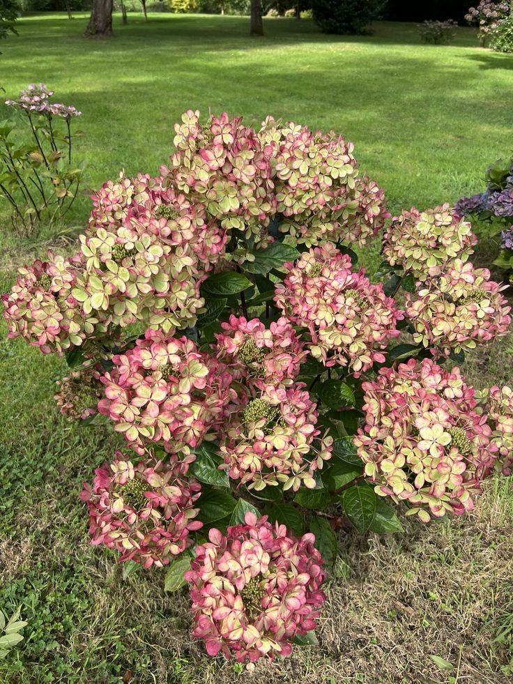 Цветки стерильные, большие, на длинных цветоножках. Соцветия в целом выглядят пастельными, постоянно меняя оттенки по мере цветения, в результате получается гармоничное сочетание белого, кремового, бледно-зелёного, фисташково-зелёного, розового, малиново-розового. Все эти оттенки постепенно сменяют друг друга, хорошо смешиваясь между собой. Соцветия конические с округлой вершиной, почти сферические, длиной 15-20 см. Цветение с середины июля до конца сентября. Куст плотный, вертикальный, хорошей формы, высотой и шириной 120-150 см.